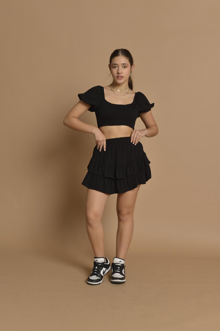A queridinha das fashion girls! Essa saia é puro charme para quem ama se vestir com autenticidade e conforto. Feita em viscolycra, ela tem toque suave e caimento impecável, proporcionando liberdade de movimento. As camadas em babado criam um efeito fluido e romântico, que combina perfeitamente com o estilo moderno e descomplicado da moda teen.