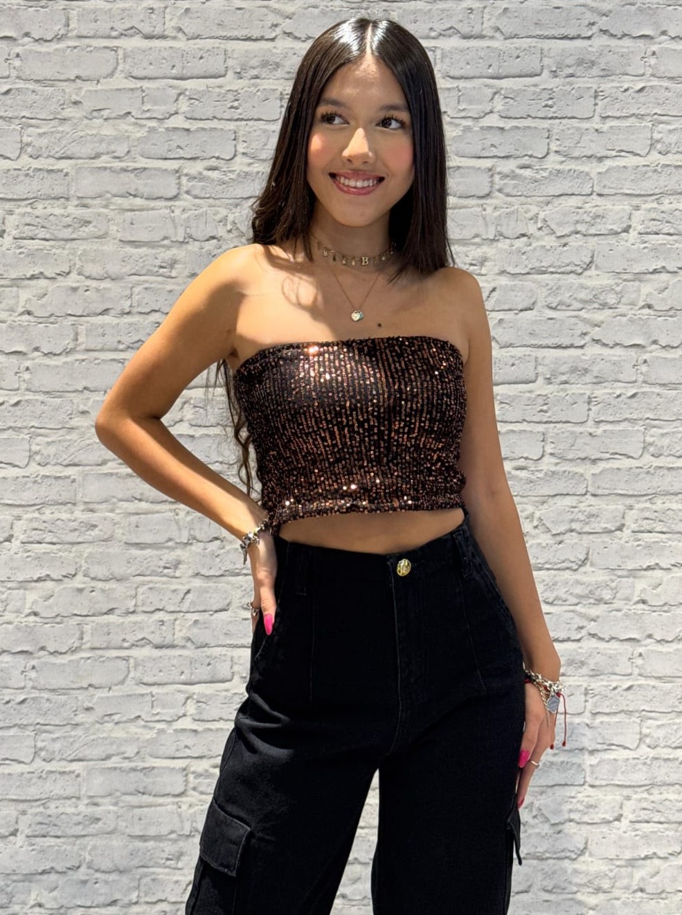 Esse top tomara que caia é a escolha perfeita para as meninas que amam moda teen moderna e não têm medo de se destacar. Todo em paetê, ele traz aquele efeito glow que transforma qualquer look básico em uma produção de arrasar. Ideal para compor visuais fashionistas em festas, rolês ou até mesmo no dia a dia com um toque ousado. 🌟 Combine com jeans de cintura alta, minissaias ou jaquetinhas e prepare-se para os elogios!